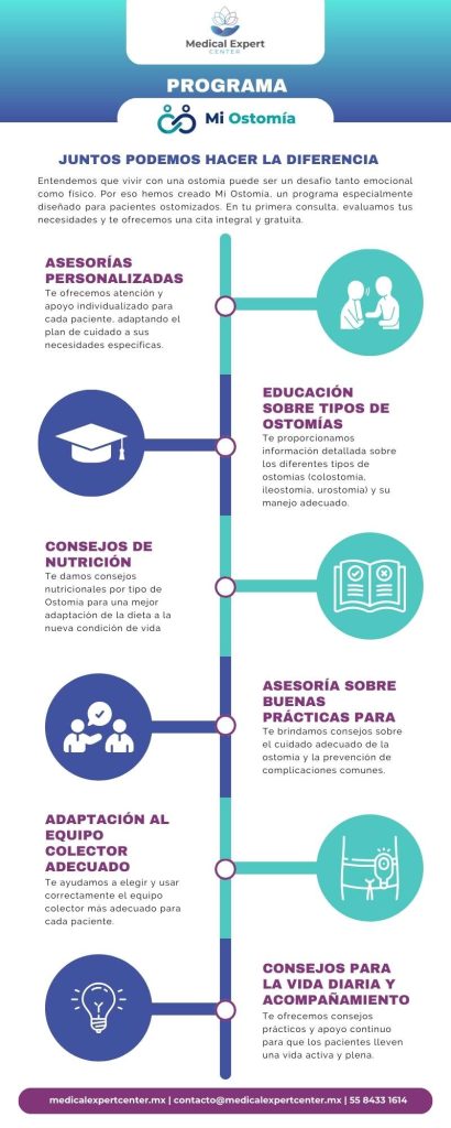 En Medical Expert Center estamos comprometidos con tu bienestar. Si buscas asesoría gratuita en ostomía, consulta especializada para el cuidado del estoma o productos de ostomía de calidad, en nuestro programa Mi Ostomía recibirás el apoyo que necesitas