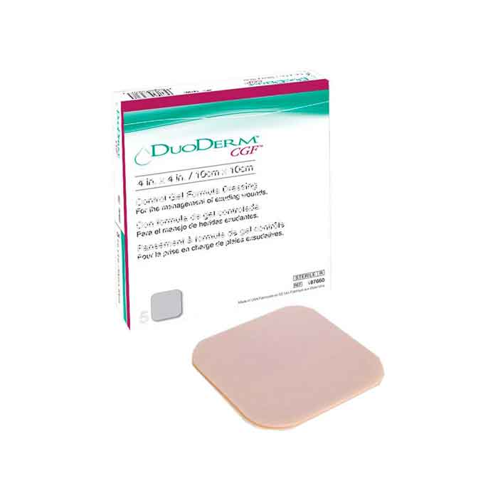DuoDERM® CGF (Control Gel Formula) de ConvaTec en el tamaño estándar de 10cm x 10cm, 20cm x 30cm y 20cm x 20cm cm es un apósito hidrocoloide estéril, esencial en el cuidado avanzado de heridas de tamaño mediano con exudado leve a moderado. Su tecnología Control Gel Formula forma un gel cohesivo al contacto con el exudado, manteniendo un ambiente húmedo óptimo para acelerar la cicatrización. Facilita el desbridamiento autolítico y protege el tejido nuevo. Es ideal para úlceras por presión (escaras), úlceras vasculares, cortes y abrasiones.